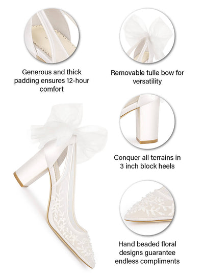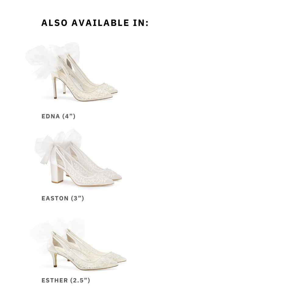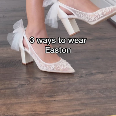 Easton offers a flattering fit with its steep vamp and stunning block heel, perfect for outdoor celebrations. Customers praised the shoes for matching their dress perfectly and providing a comfortable, elegant experience. The removable bows and ankle straps add styling versatility.