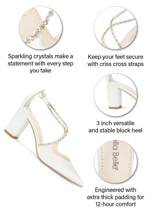 Massie 3-inch block heel dazzles with diamante crystal straps that crisscross for a secure fit.  Designed with special crystals that won’t snag your dress, it’s the perfect mix of glamour and practicality with a silhouette shape that hugs your foot for a slimming and flattering look.