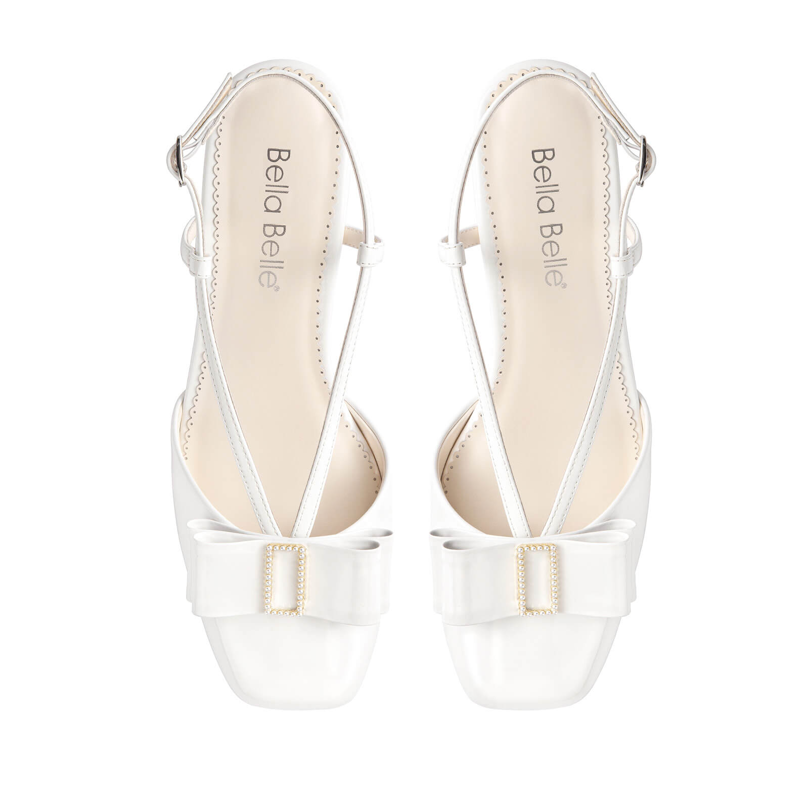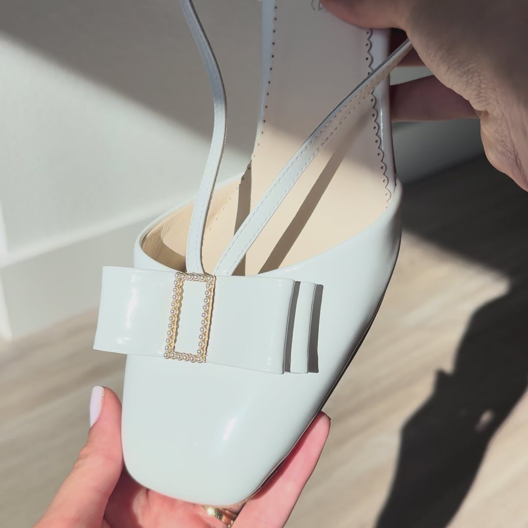A 2-inch patent leather block heel featuring a square toe, adjustable slingback straps, and a folded bow accented with pearl hardware. Ultra-plush leather insoles ensure easy comfort, making this style a polished choice for bridal or after-party looks.