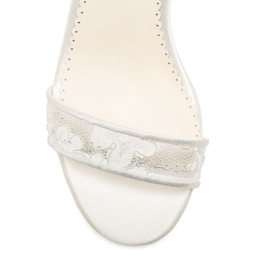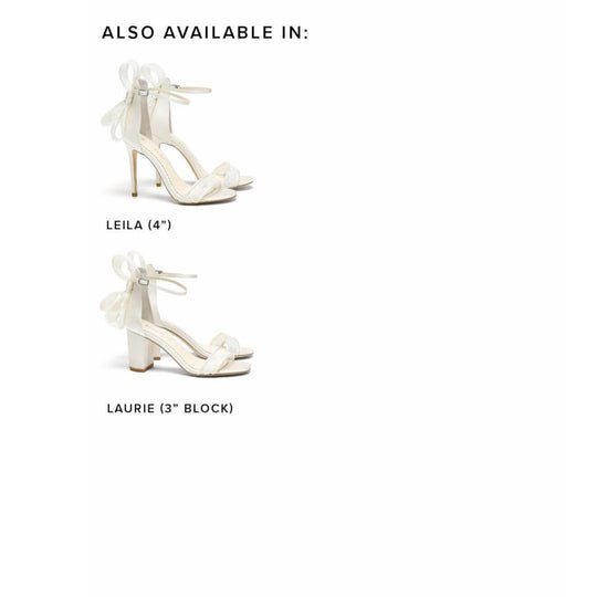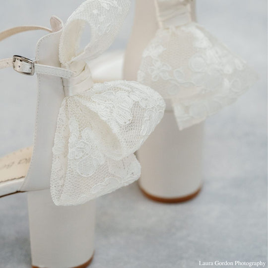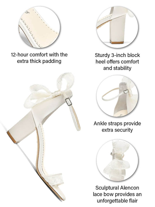 Laurie 3-inch lace block heel shoes are adorned with sculptural Alençon lace bows. The ankle strap keeps you secure, while the open toe lets your pedicure shine. Laurie lace bow open toe heels are perfect for modern brides who love a classic bridal reference.