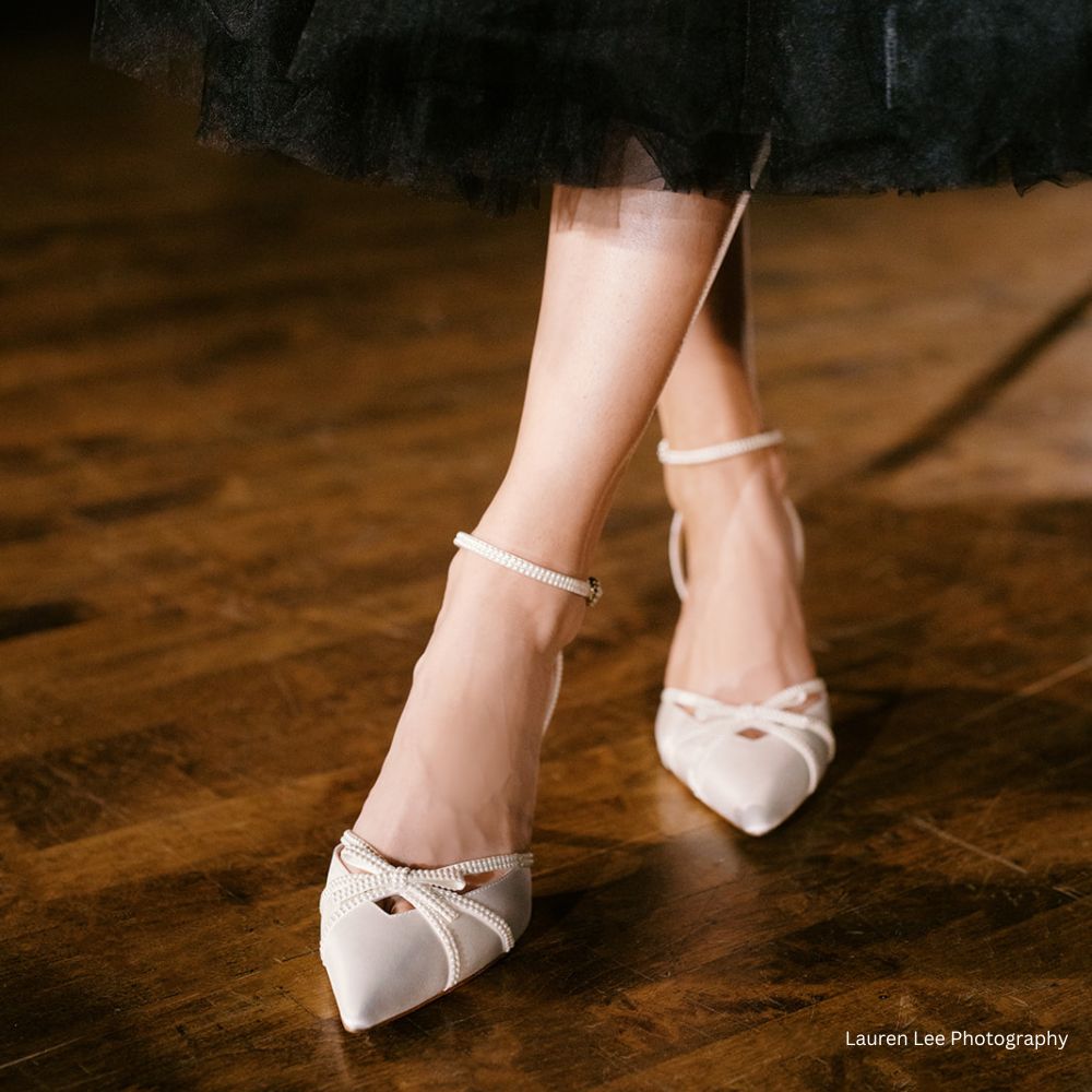 Want confidence and cool-girl glam? Alix’s 3-inch wedding cone heel with pearl straps brings timeless style and stability, while the pointed closed-toe elongates your legs.  Secure ankle straps on these pearl bow wedding shoes keep you stable, and the silhouette shape hugs your foot for a slimming and flattering look.
