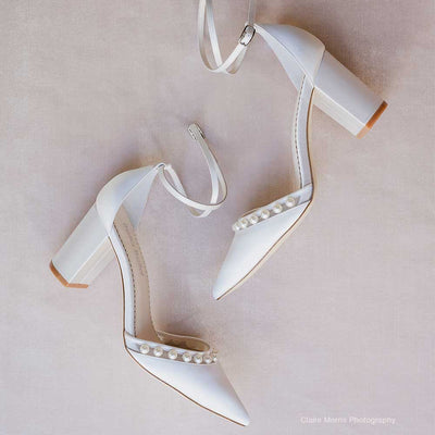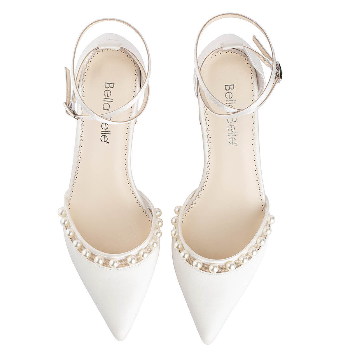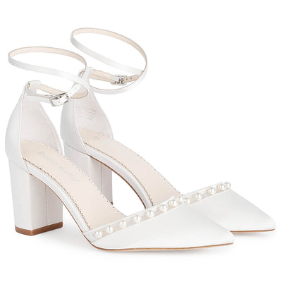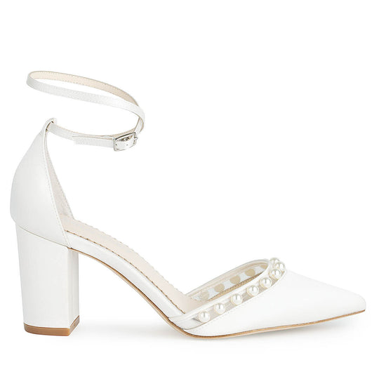 The Emery wedding shoe features a classy and elegant look with a pointed toe and pearl details, offering a secure fit with double ankle straps. Customers appreciate its timeless elegance and comfort, though some find the ankle strap too tight.