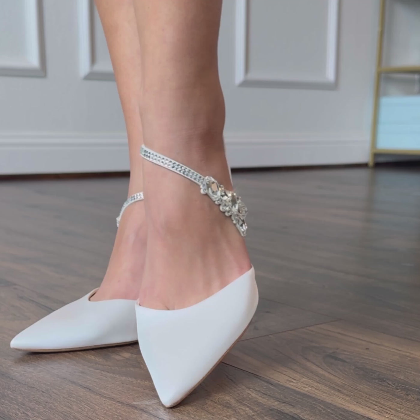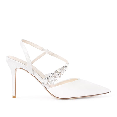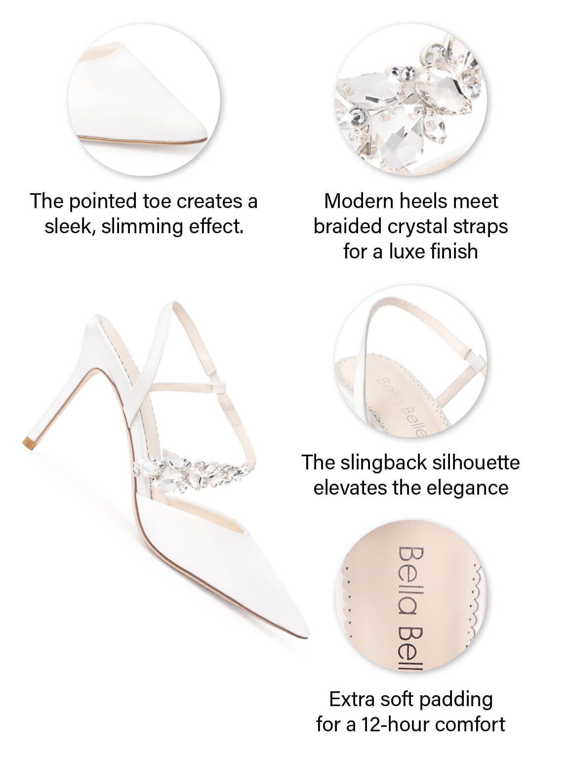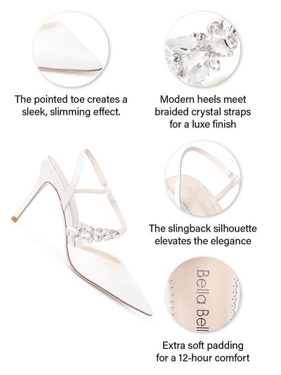 Shine with every step in Lana’s 3.5-inch heels, featuring snag-free crystals that catch the light, not your dress. Sleek ivory silk, a pointed closed-toe, and a chic slingback keep it polished, modern, and secure.