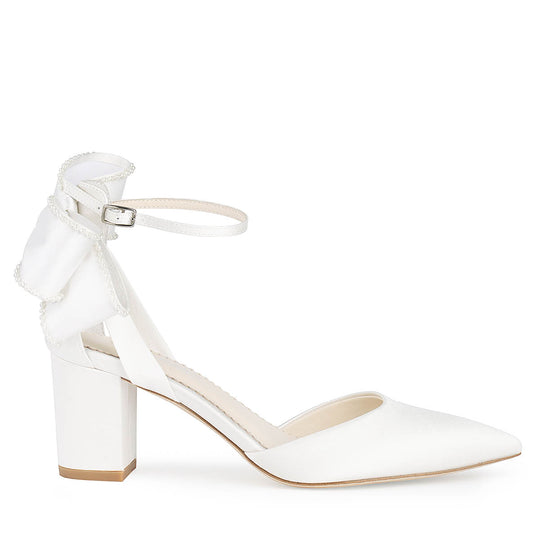 Molly is a 2.5-inch block heel that’s equal parts chic and practical. Sleek and minimal in front, she stuns from behind with pearl-embellished bows and delicate ankle straps for a secure fit. These pearl bow heels are perfect for outdoor weddings, garden parties, or any moment that calls for elegance and ease.