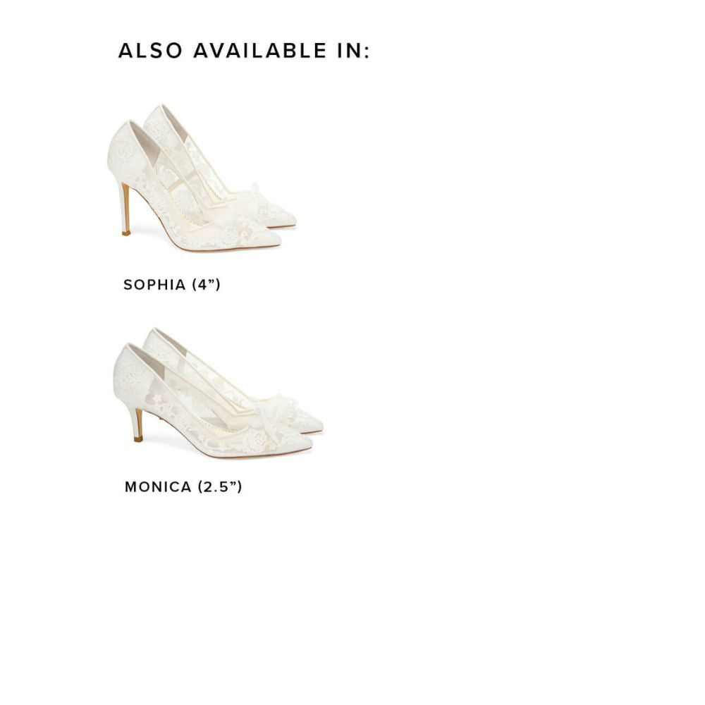 Monica's 2.5-inch flower wedding shoes deliver timeless elegance with the heirloom-quality floral lace detail. A petite ivory picot ribbon bow on the breathable and flexible mesh makes these ivory kitten heel bridal shoes perfect for classic, lace-inspired bridal ensembles.