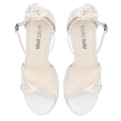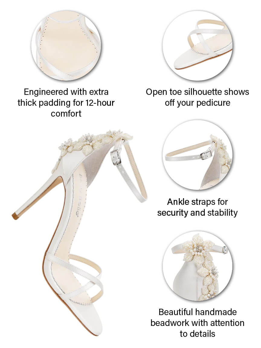 Gardenia 4 inch ivory ankle strap heels feature a 3D floral sculpture with pearls and beads that create a garden-like illusion. An ankle strap adds a secure fitting and comfortable finish to these ivory pearl wedding shoes.