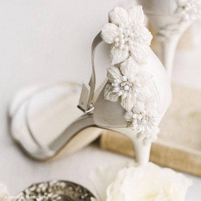 Ankle Strap Ivory Pearl Wedding Shoes with 3D Floral Sculpture