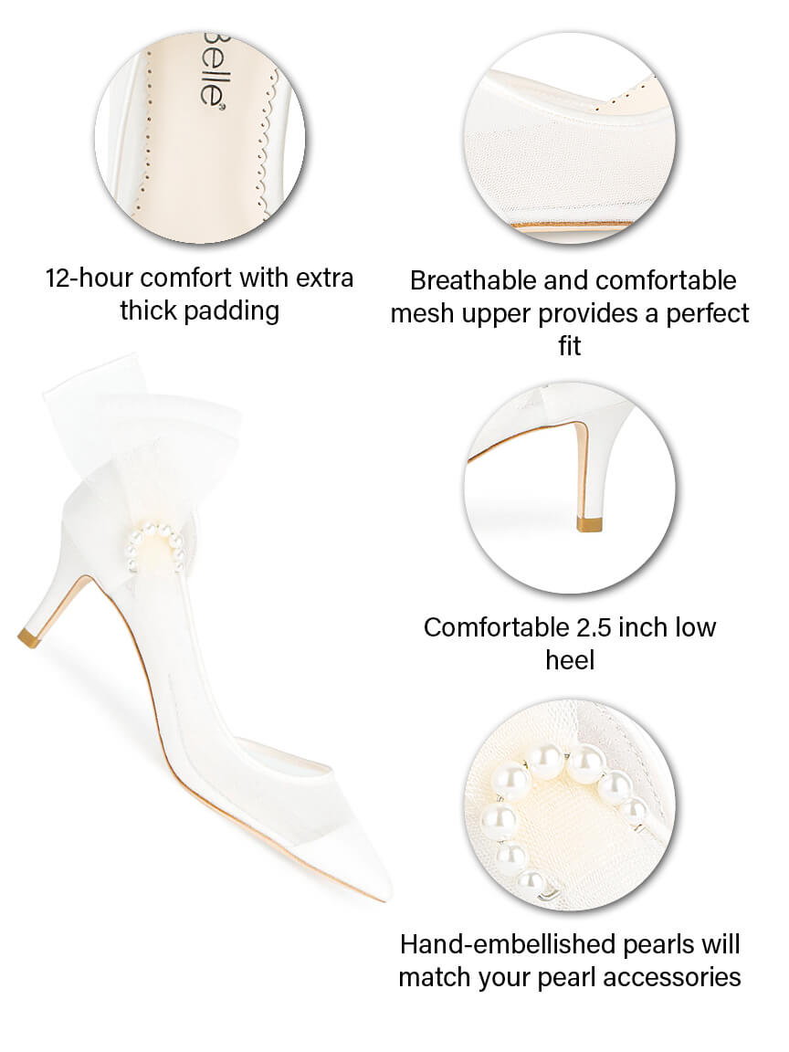 With a comfy low 2.5-inch heel and breathable mesh that molds to your feet, Rae is the perfect mesh ivory kitten heels. The crescent-shaped pearl buckles topped with playful grosgrain bows are a flawless match for your accessories!