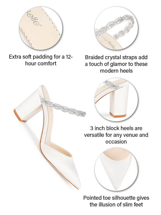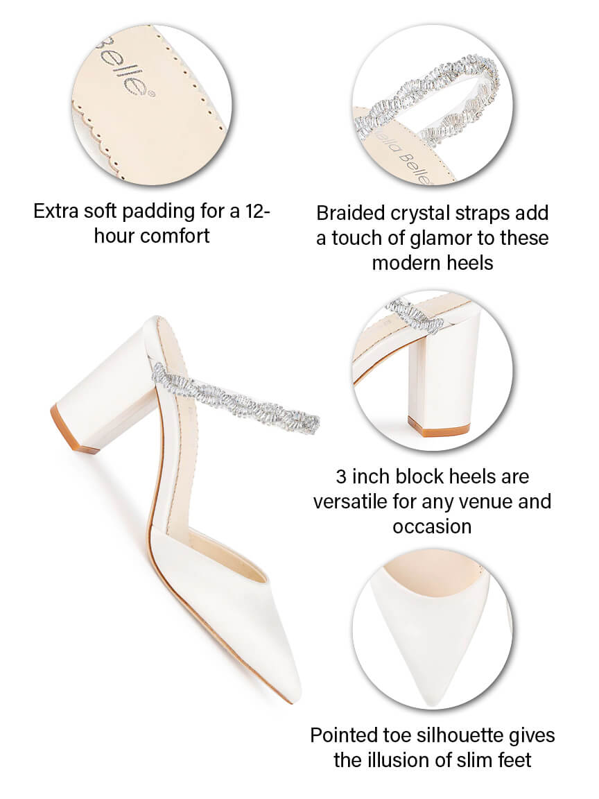 At 3 inches, Weslyn wedding mules offer the perfect blend of glam and comfort. Dazzling crystal straps keep you secure as you dance the night away while the block heel provides stability for every step. Slip into these comfortable bridal mules easily.