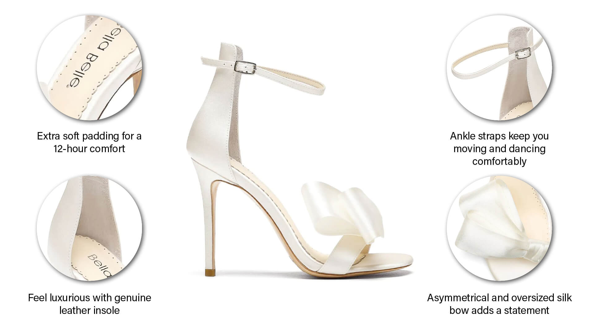 Zoey 4-inch stiletto wedding shoes feature asymmetrical silk bows for a bold modern look and ankle straps for all-day comfort. The open toe shows off your pedicure, making these open-toe bridal heels the perfect mix of luxury and